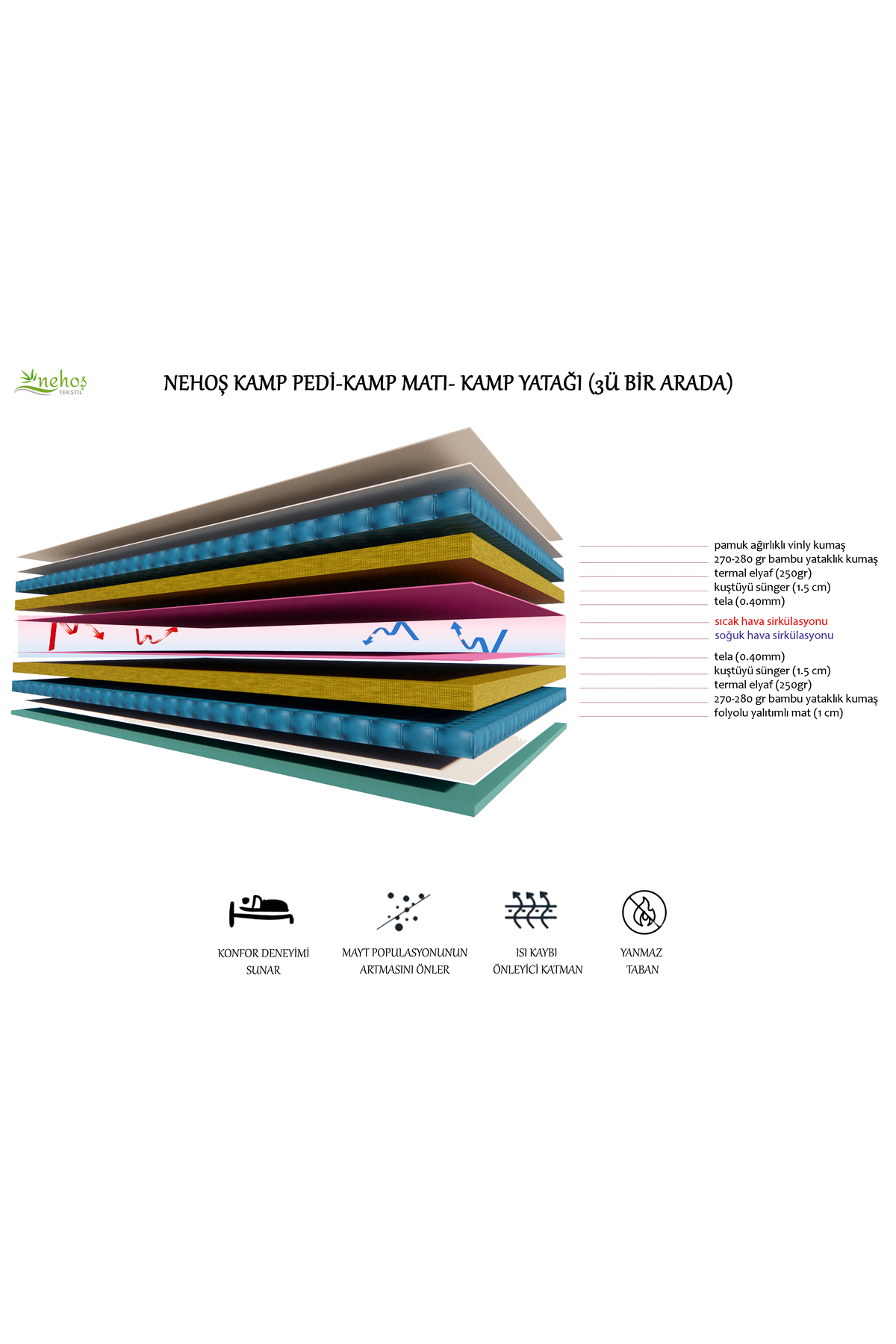 !!! 1 VİSKO KIRPINTILI BAMBU KILIFLI YASTIK HEDİYE !!! Ürün Açıklaması: ; ÜRETİM TAMAMEN BİZE AİTTİR. ; BİR ÜRÜNDÜR. ; ÇOK AMAÇLI KULLANIM SAĞLANABİLİR( MAT+PED+YATAK) ; GÜVENİLİR VE RAHAT UYKU. ; ERGONOMİK YAPISI SAYESİNDE SİZE RAHAT UYKU SAĞLAR. ; HAFİF,RAHAT TAŞINABİLİRLİK ; ÜZERİ ÖZEL HAZIRLANMIŞ TERLEME YAPMAYAN PAMUK DOKU AGIRLIKLI VİNLY MALZEMEDEN ÜRETİLMİŞTİR. ; ŞİŞME YATAKLAR GİBİ PATLAMA VEYE HAVASI İNME RİSKİ YOKTUR ; ALT TARAF METALİZE KAPLAMADIR.ISI VE SU GEÇİRMEZ. -20 ° DENENMİŞTİR ; İSTER YATAK OLARAK KULLAN İSTER FERMUARINI AÇARAK MAT OLARAK KULLAN ; Özellikleri: ; EBAT: 180 X 60 X 4,5 CM. ; HAV YÜKSEKLİK.4CM ; AĞIRLIK: YAKLAŞIK 3,5KG ; YIKAMA BİR BÜTÜN OLARAK 40 ° SU +DETERJANLA ALT FOLYOYU ZEDELEMEDEN YIKAYABİLİR VE UYGUN BİR YERE ASARAK DURULAYIP KURUTABİLİRSİNİZ ; VEYA MAT TAN AYIRARAK 40 ° SU+DETERJAN YIKAYABİLİR VE UYGUN BİR YERE ASARAK DURULAYIP KURUTABİLİRSİNİZ ; TAZİKLİ SU+FARKLI DETERJANLARLA DAYANIKLILIĞI TEST EDİLMİŞTİR (HİÇ BİR DEFORME VE YIPRANMA OLMAMIŞTIR) ; BU ÜRÜN NEHOŞ TEKSTİL MARKASI İLE ÜRETİLMİŞTİR. ;